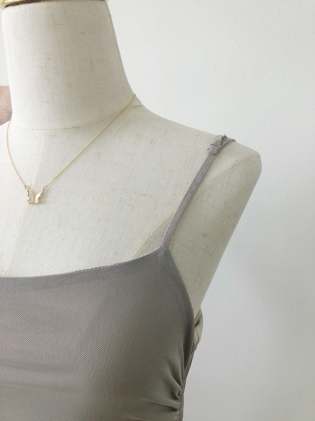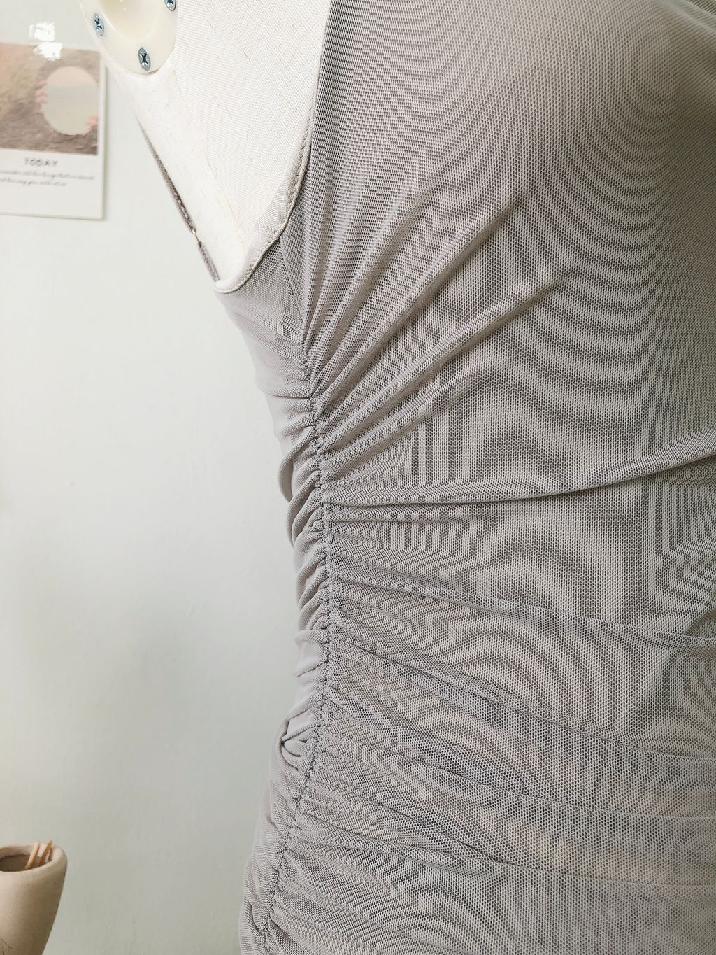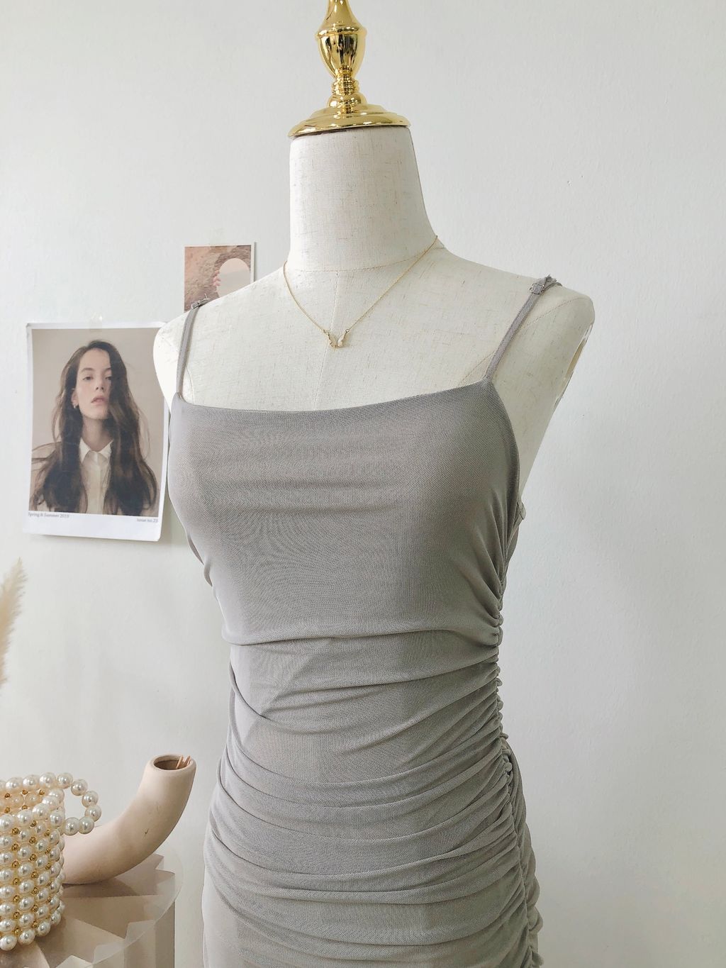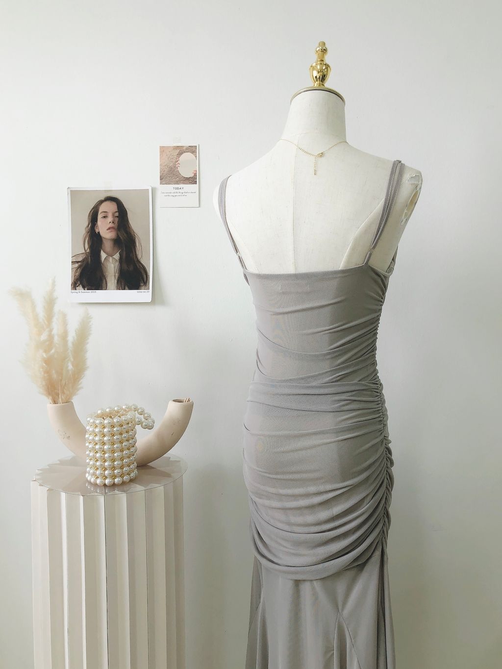 Features: Premium chiffon mesh material , comfy texture , slightly stretchable , spaghetti ruched mesh dress , irregular mermaid dress design , adjustable straps , slim-fit cutting , come with inner lining .