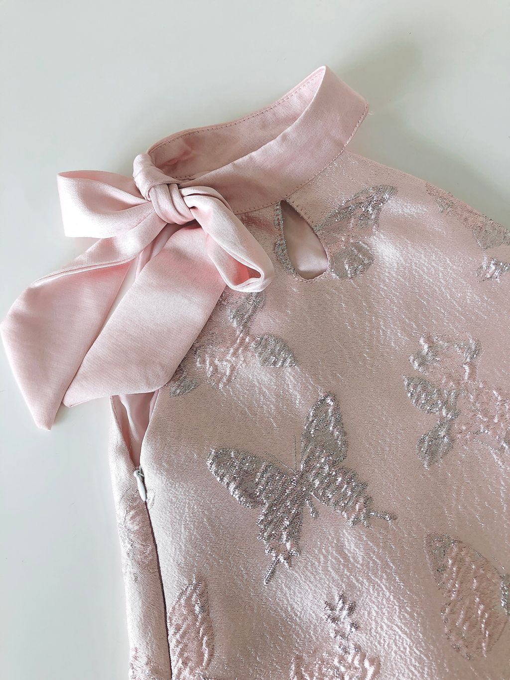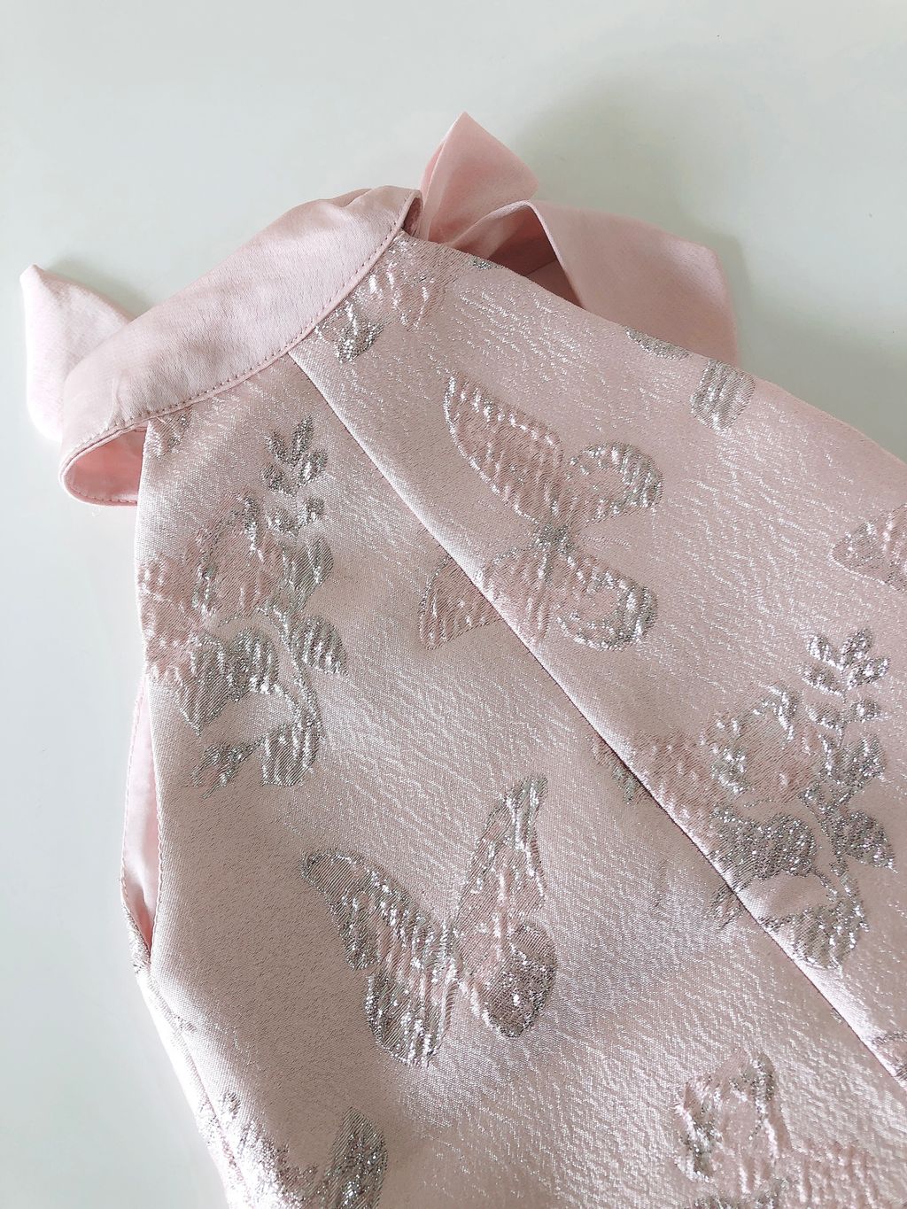Features: Premium satin material , embroidery butterfly halter girl dress , A-shaped cutting , self-tied ribbon , come with inner lining , comfy texture , concealed side zipper .