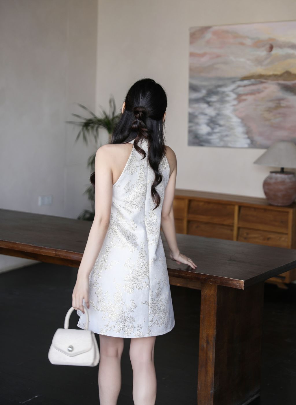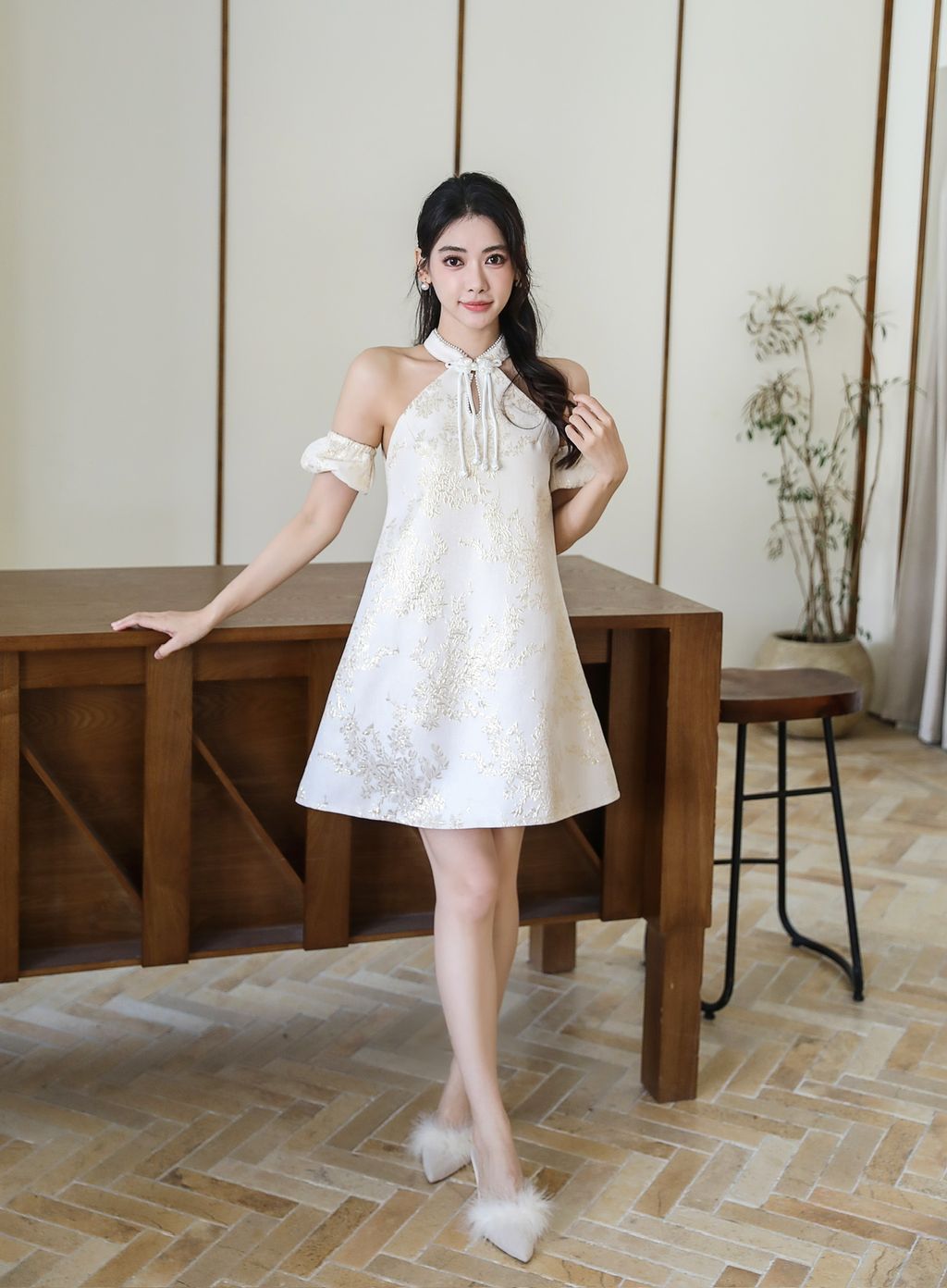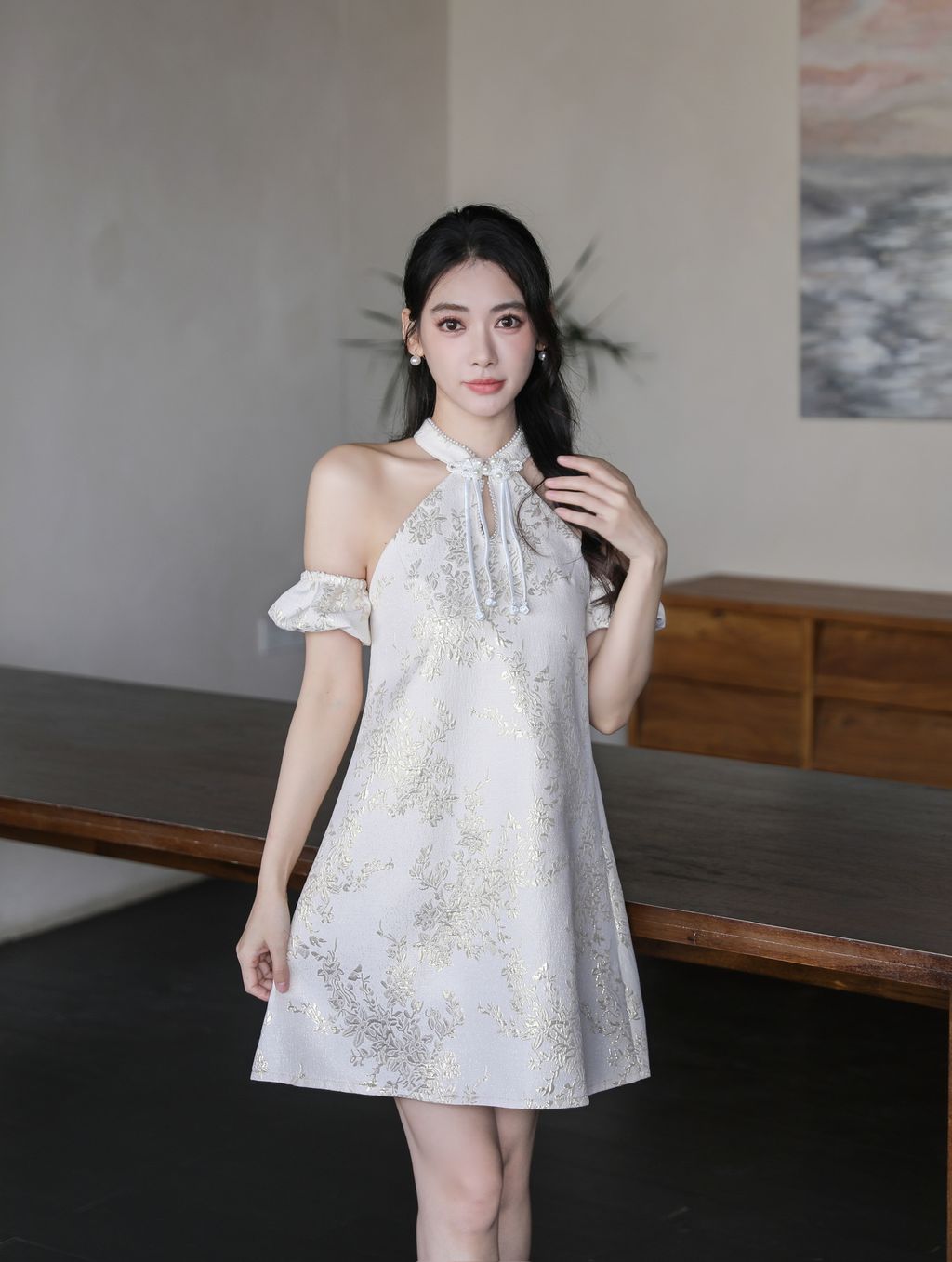 Features: Premium mixed cotton material , 3D embroidery golden cheongsam halter dress , A-shaped cutting , back zipper , detachable puffy sleeves , come with inner lining , comfy texture .