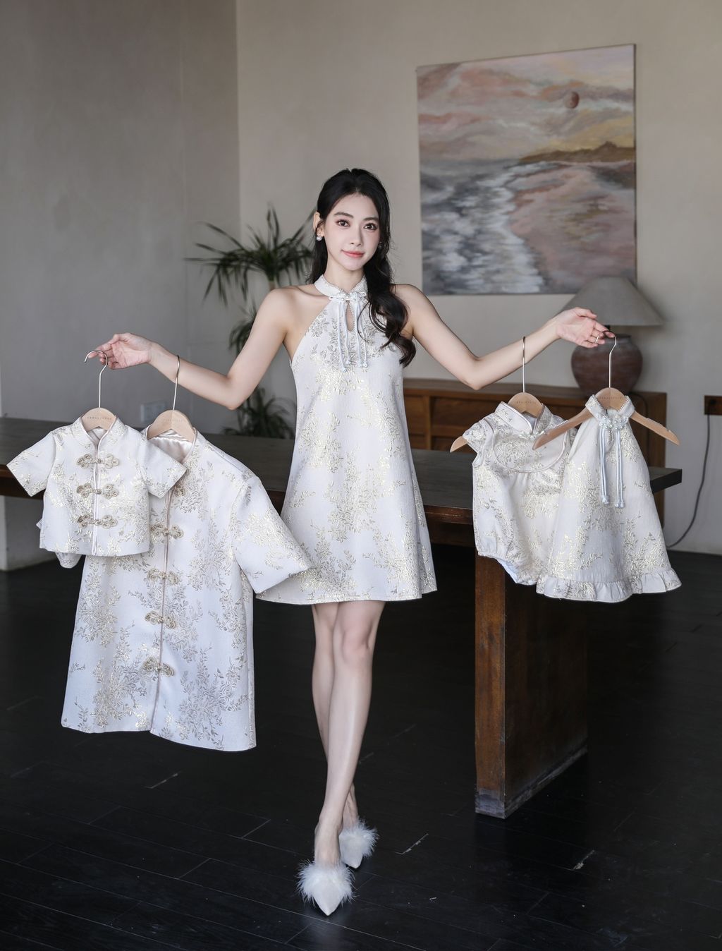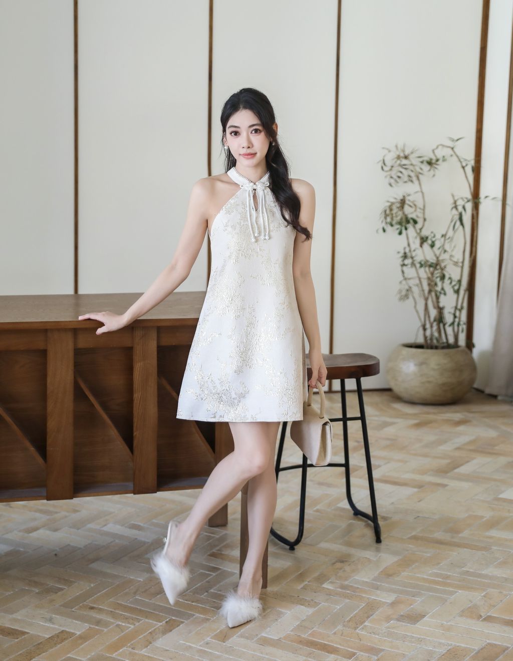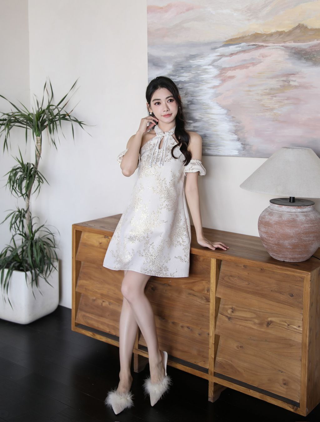 Features: Premium mixed cotton material , 3D embroidery golden cheongsam halter dress , A-shaped cutting , back zipper , detachable puffy sleeves , come with inner lining , comfy texture .