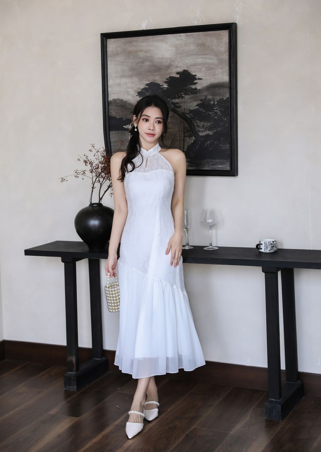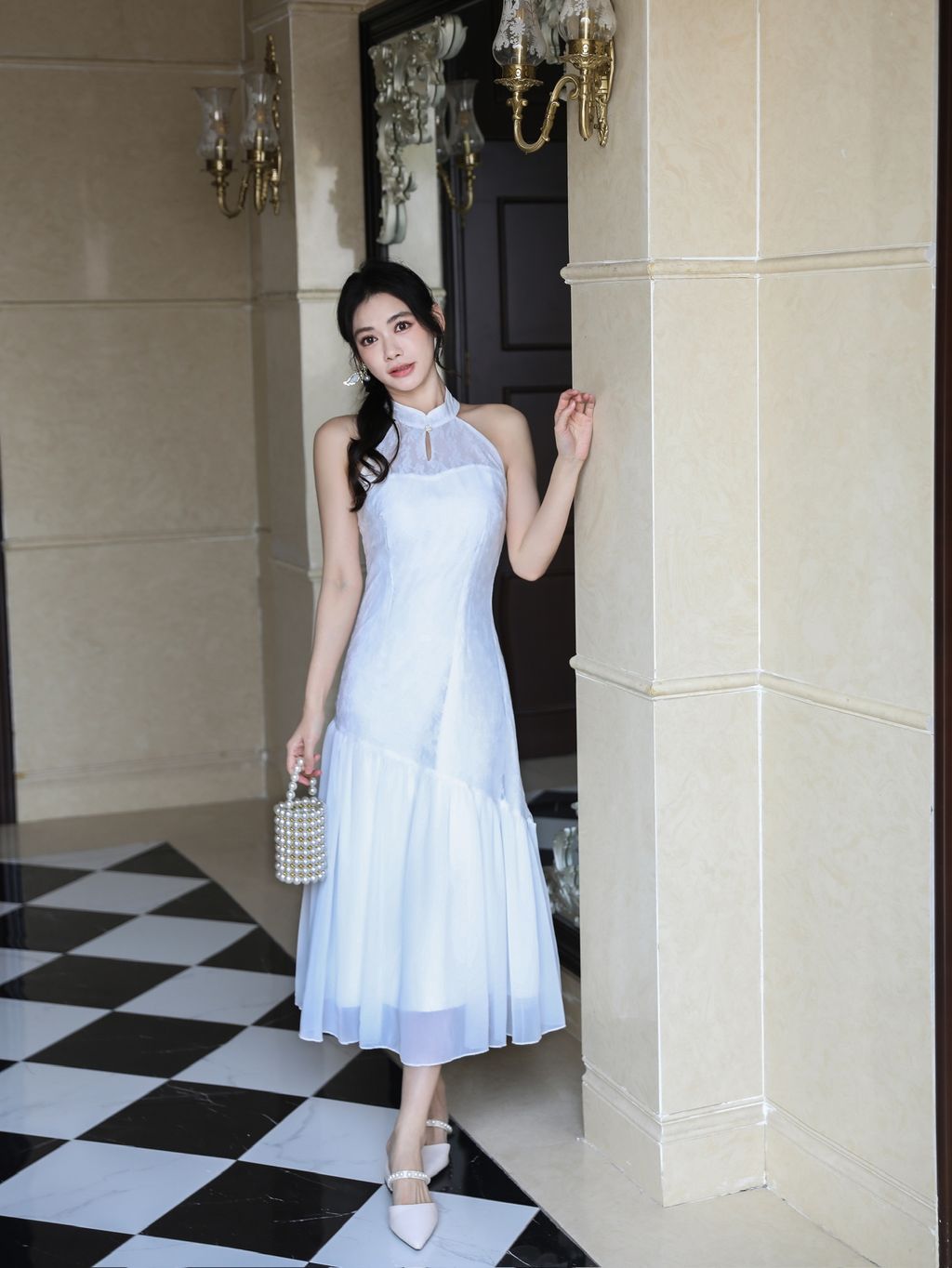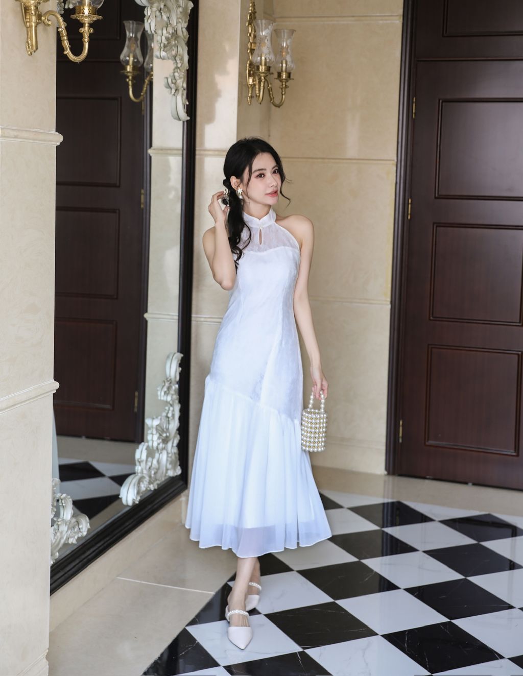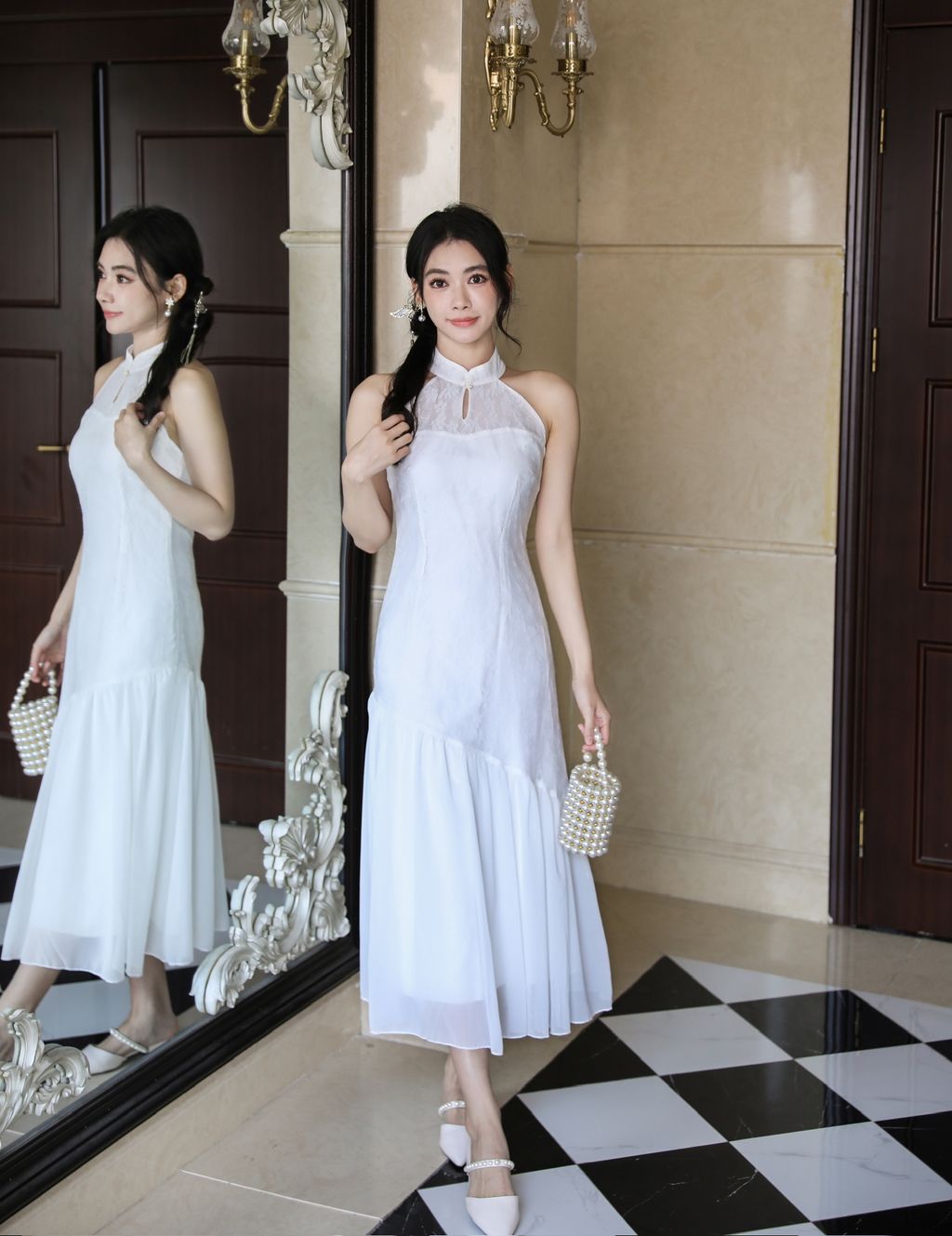 【沉鱼落雁】 Mermaid Lace Halter Cheongsam Dress (White)