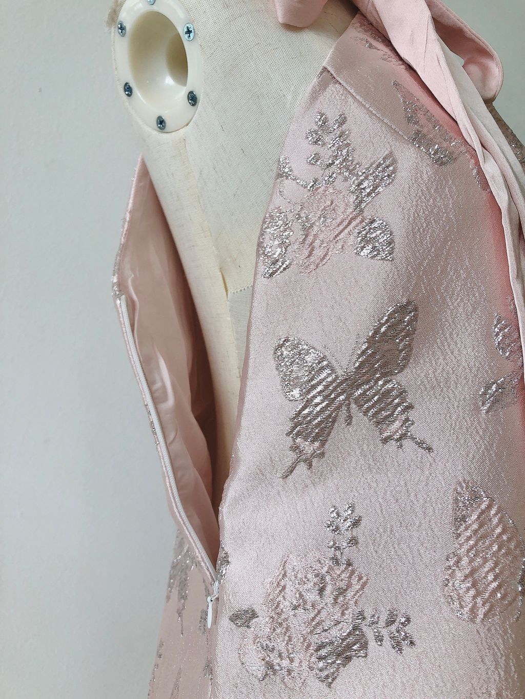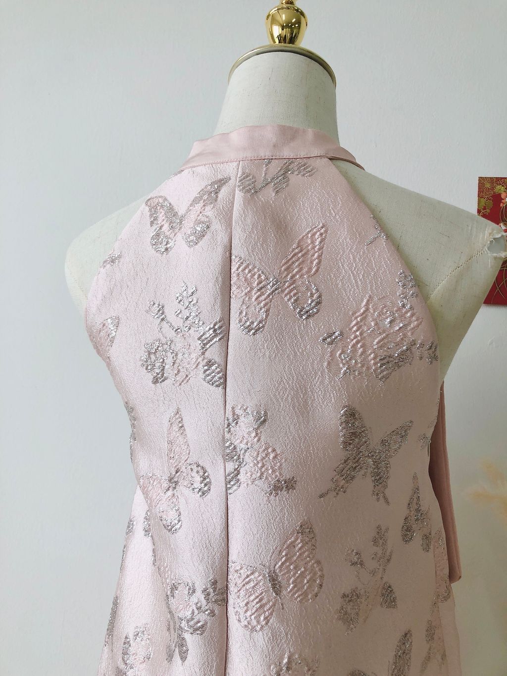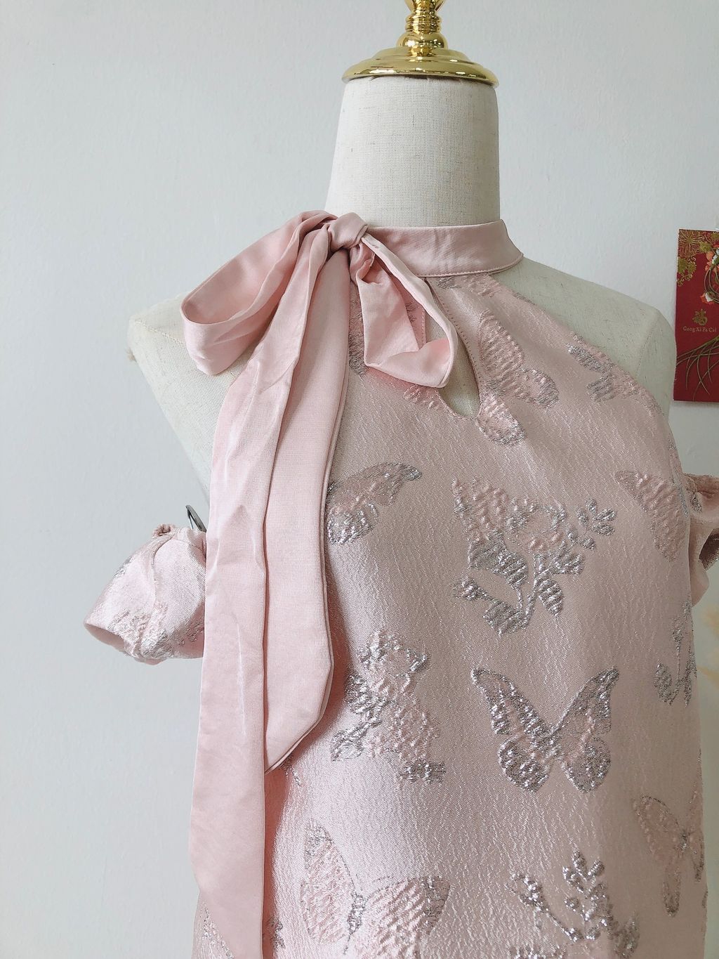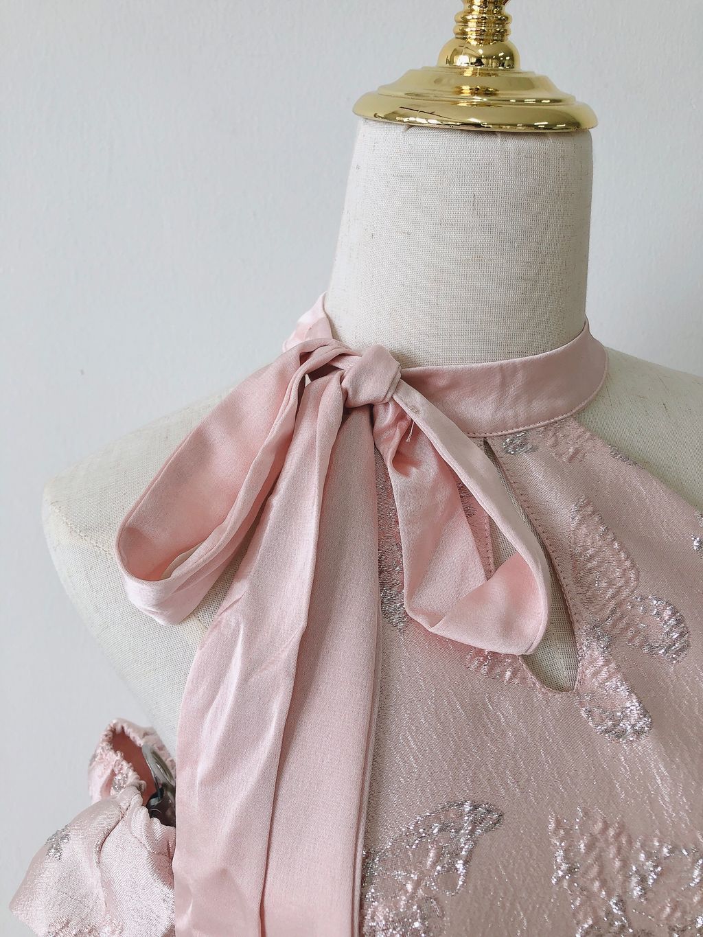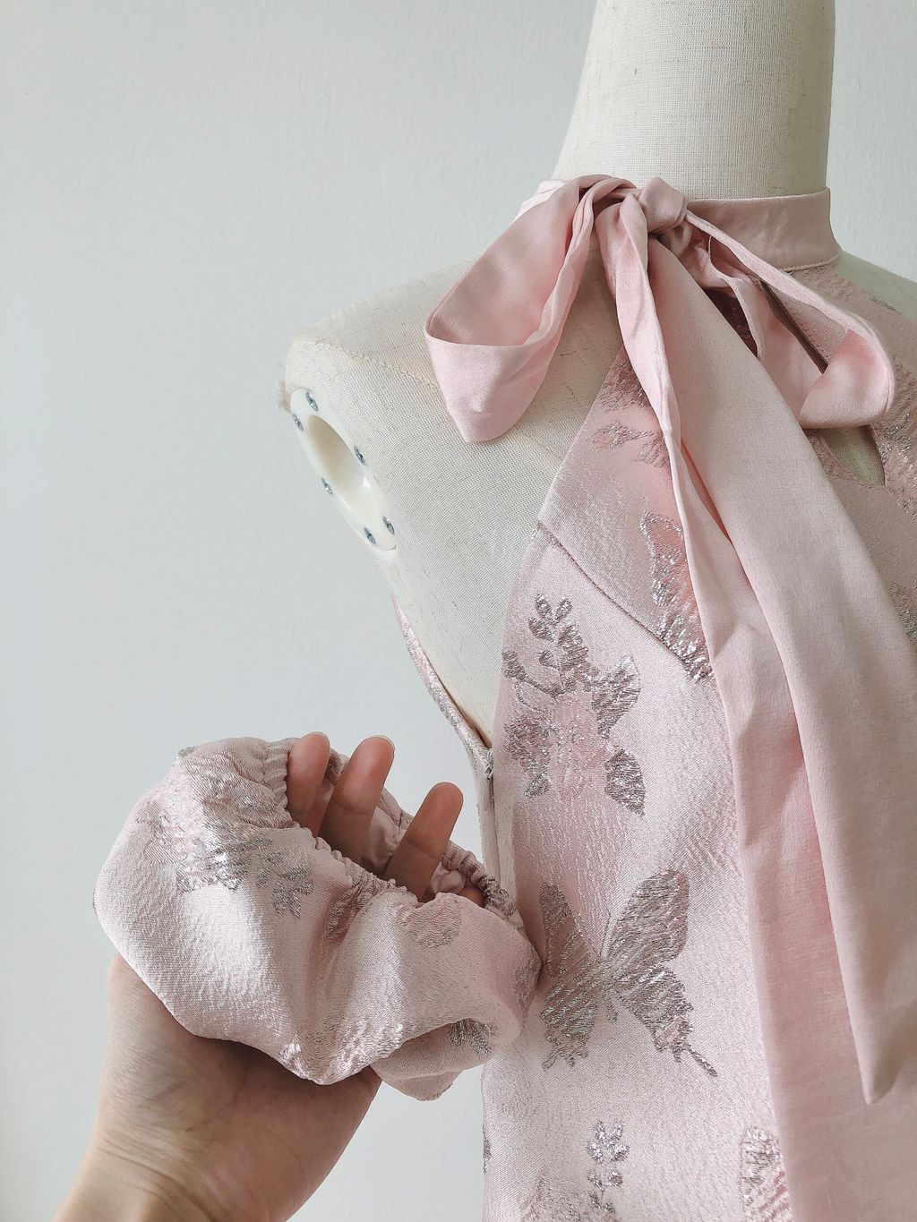 Features: Premium satin material , embroidery butterfly halter dress , A-shaped cutting , self-tied ribbon , concealed side zipper , comfy texture , come with inner lining , come with detachable puffy sleeves , stretchable sleeves .