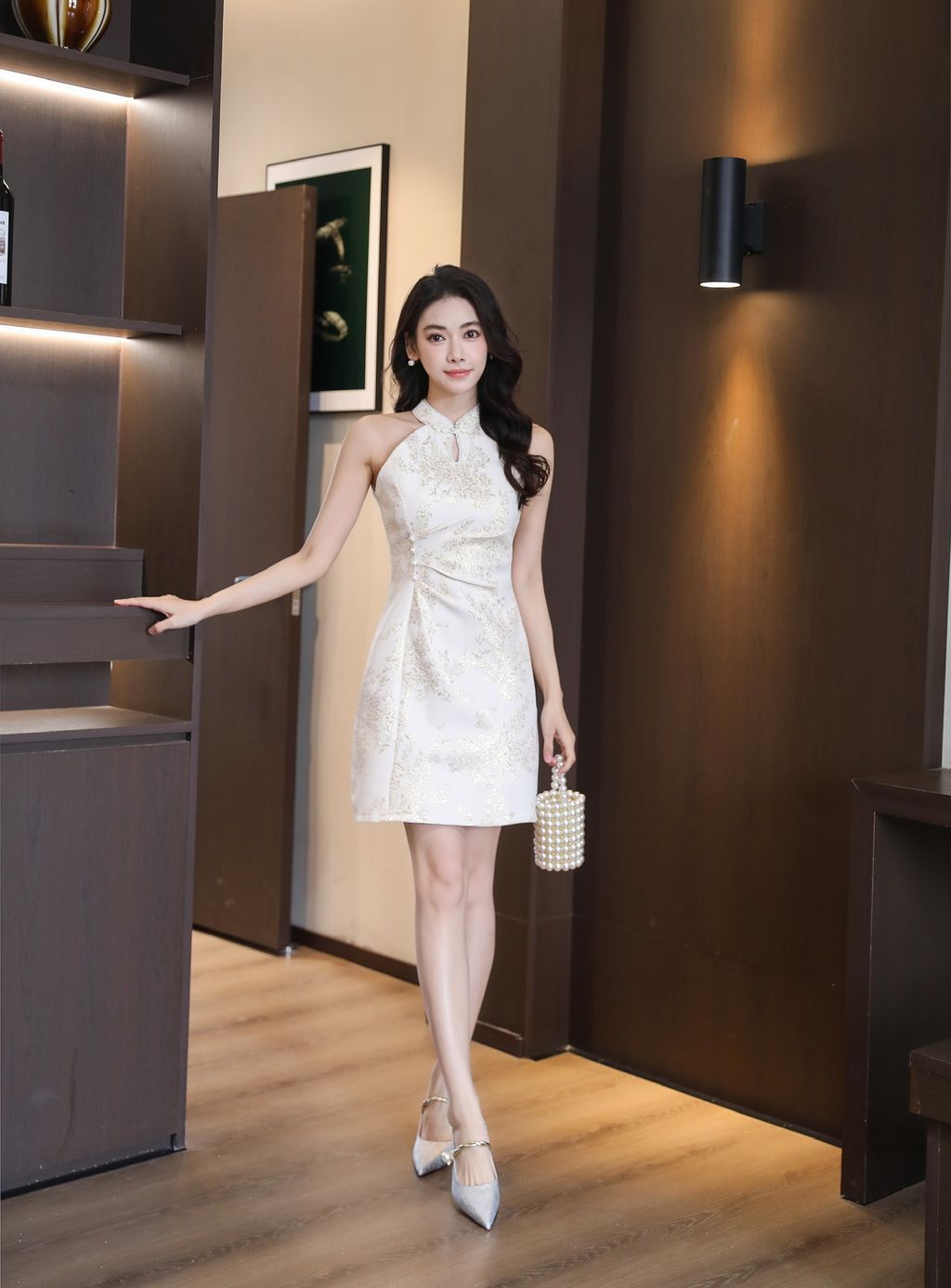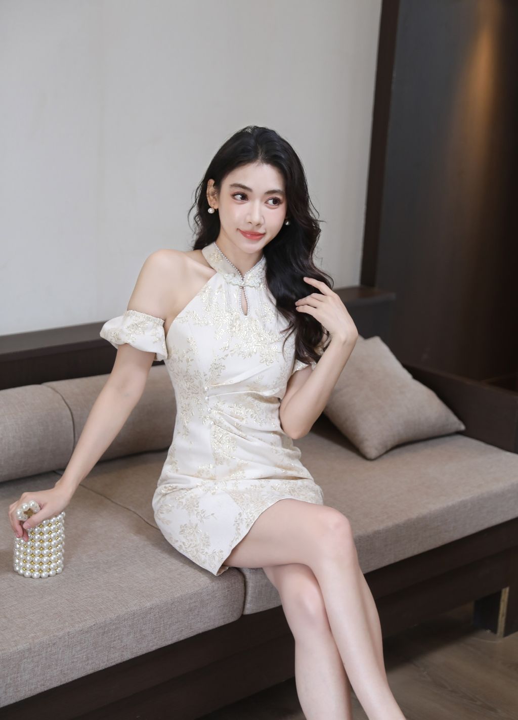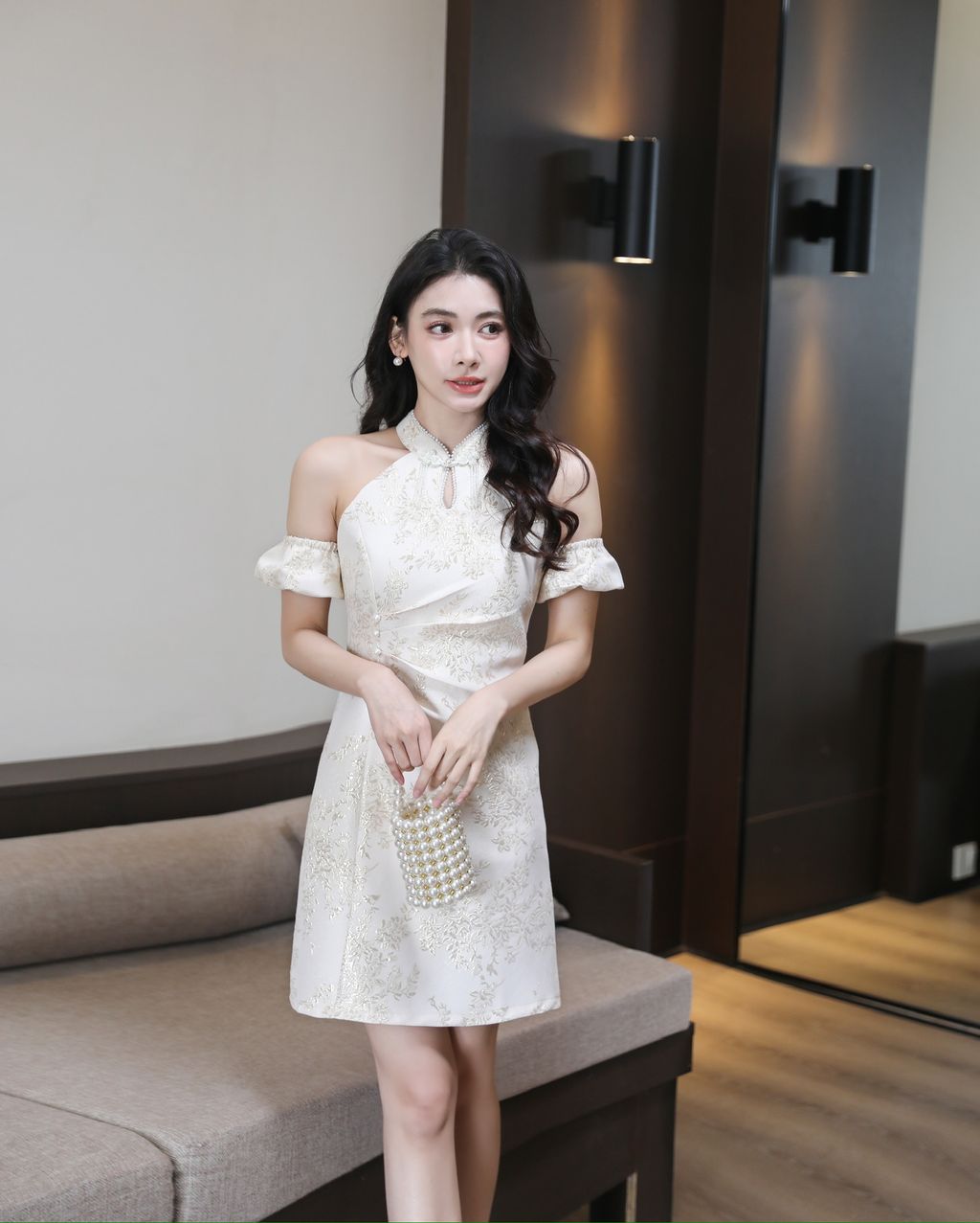 Features: Premium mixed cotton material , 3D embroidery golden cheongsam halter dress , back zipper , detachable puffy sleeves , come with inner lining , comfy texture , slim-fit cutting .