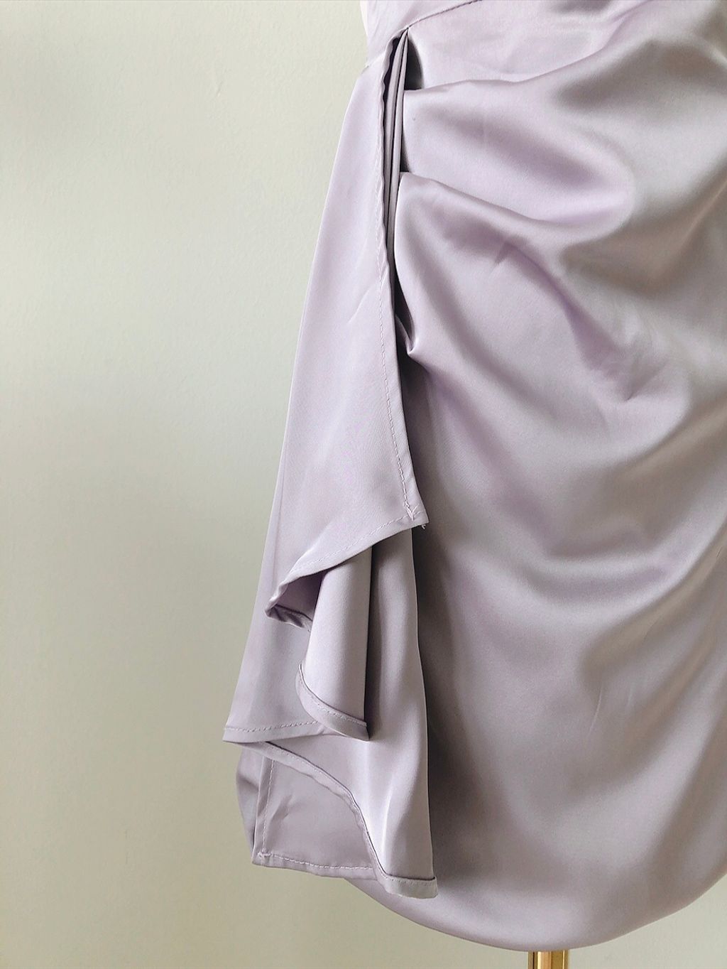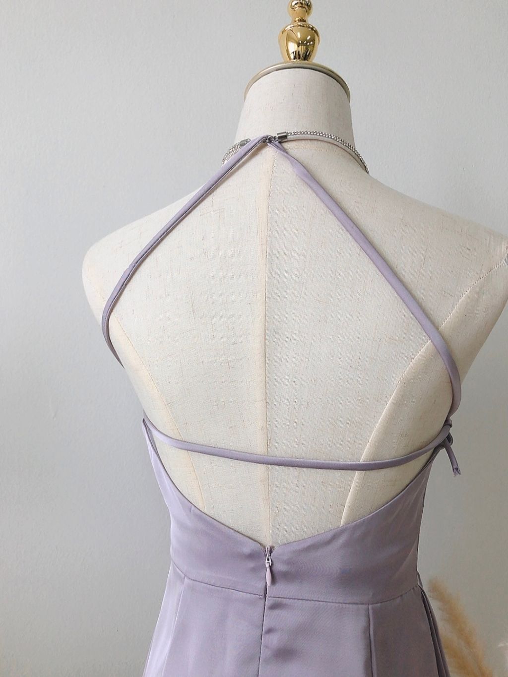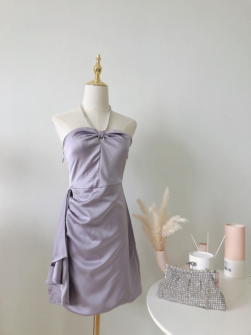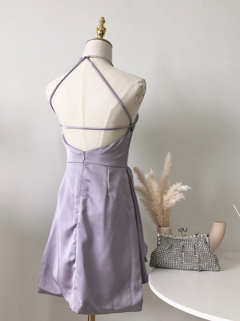 Features: Premium silky satin material , halter ruffle mini dress design , come with diamond neck chain , self-tighten clasp , slim-fit cutting , come with anti-slip tape , inner lining , comfy texture , concealed back zipper .