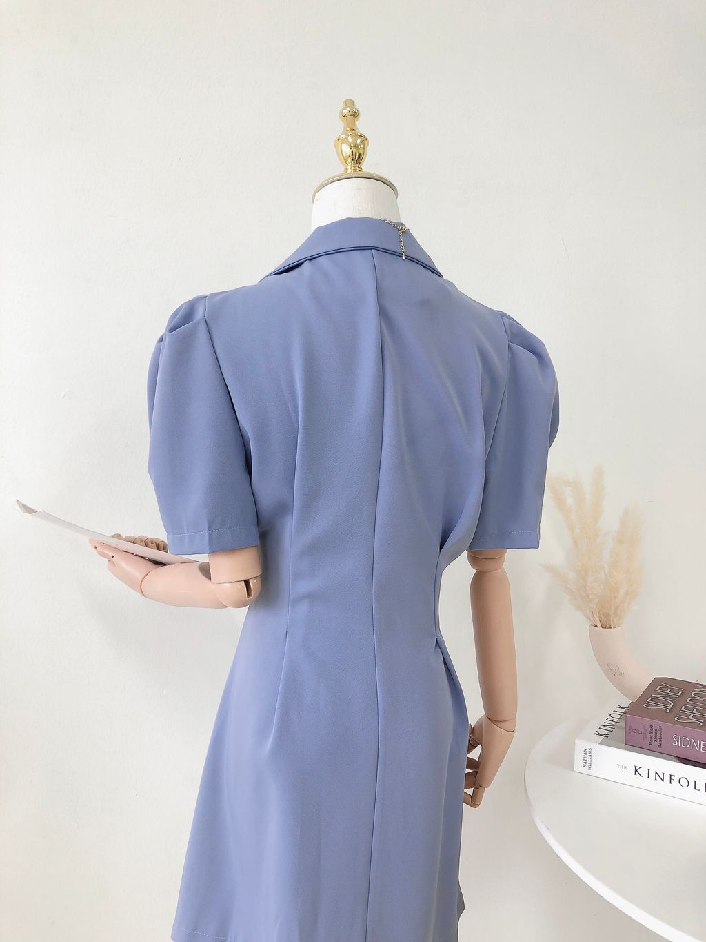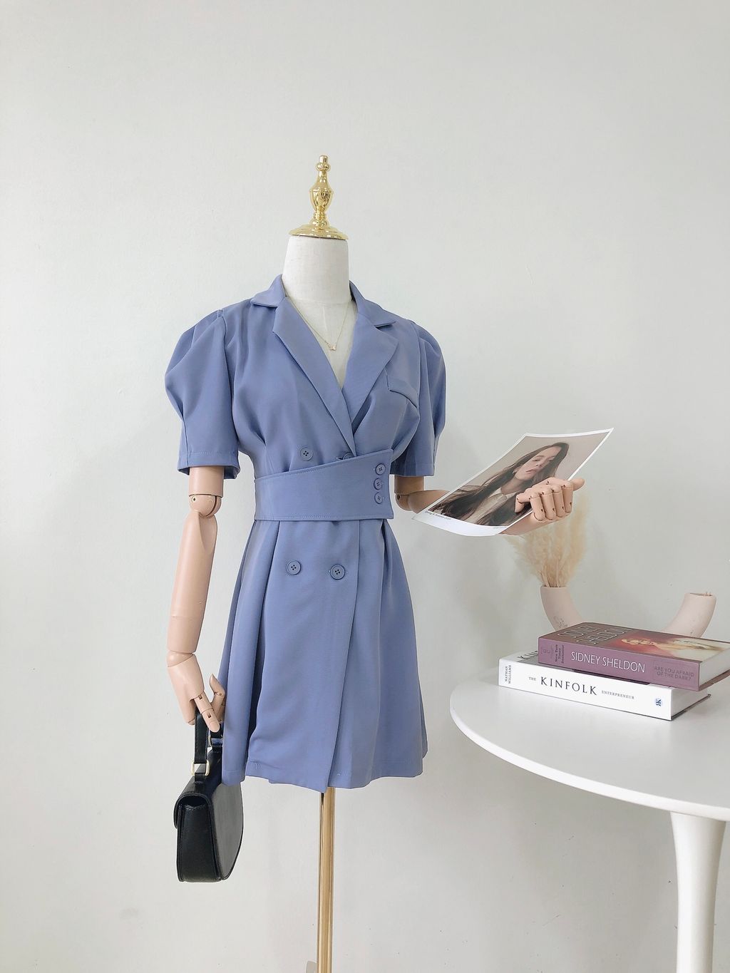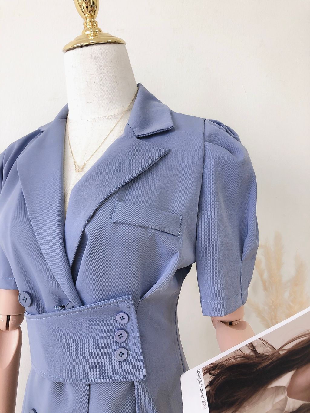 Features: Premium chiffon material , collared suit dress design , puffy sleeves , high waisted , self-tied belt , functional buttons .