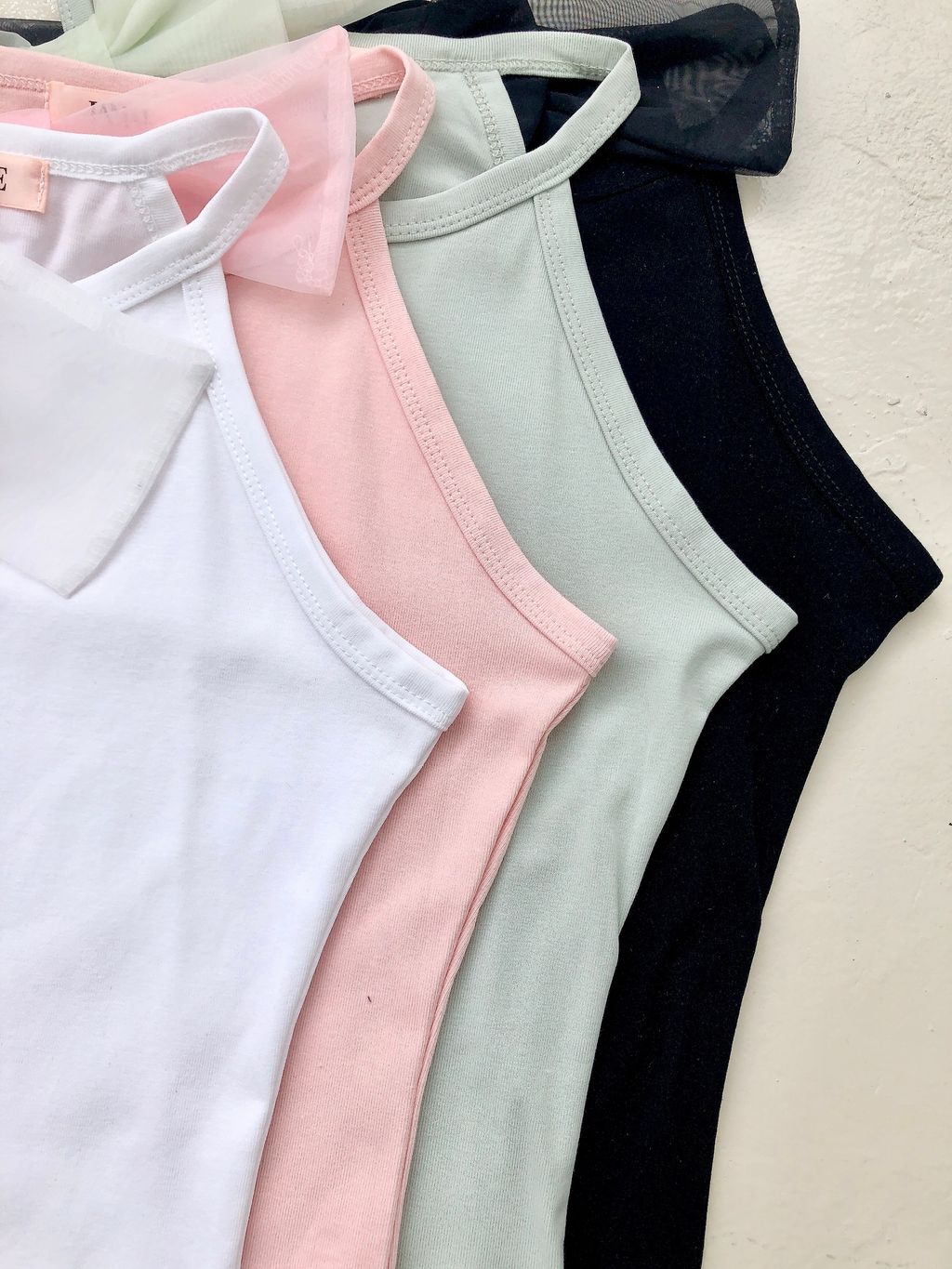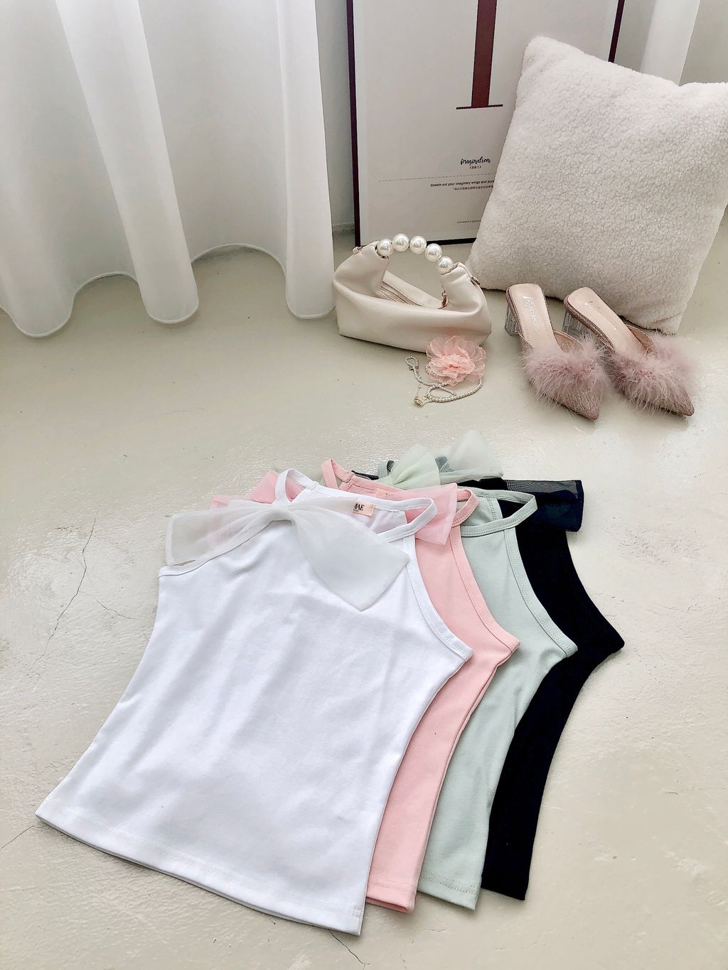 Features: Premium pure cotton material , stretchy materials , mesh ribbon halter tank top design , easy to match with any bottom .