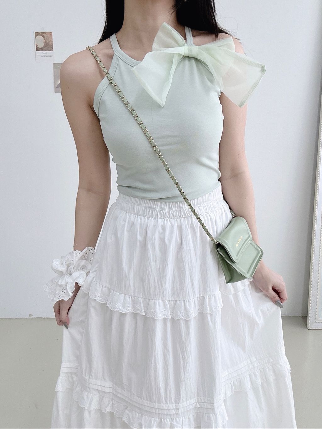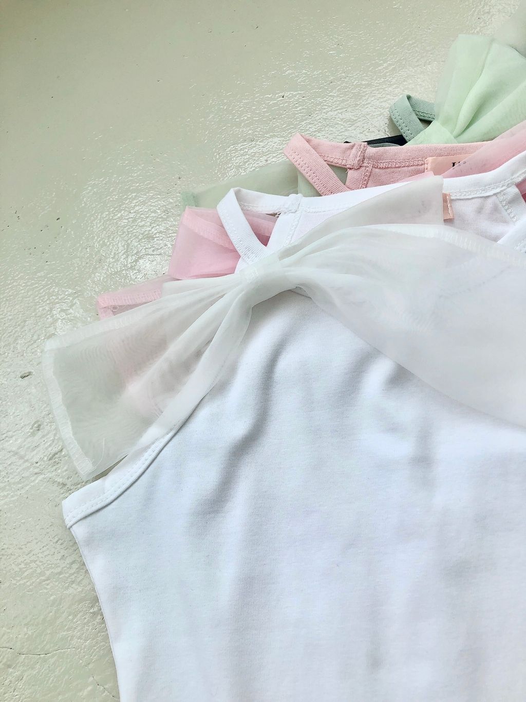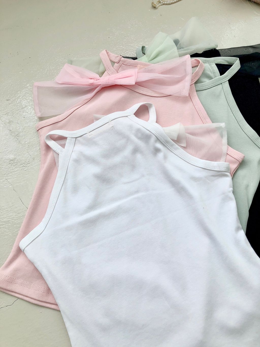 Features: Premium pure cotton material , stretchy materials , mesh ribbon halter tank top design , easy to match with any bottom .