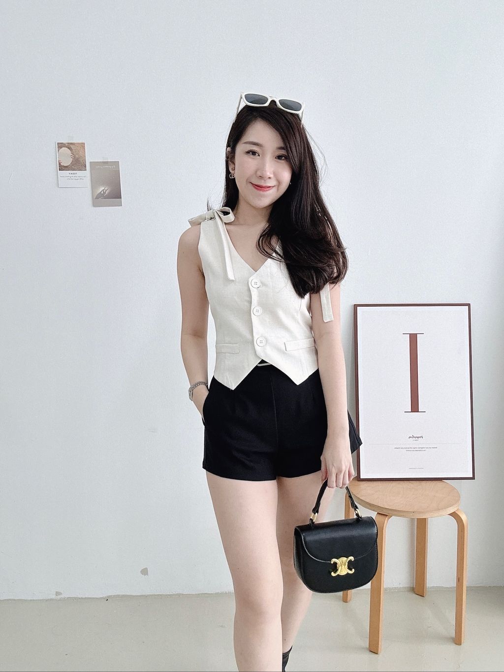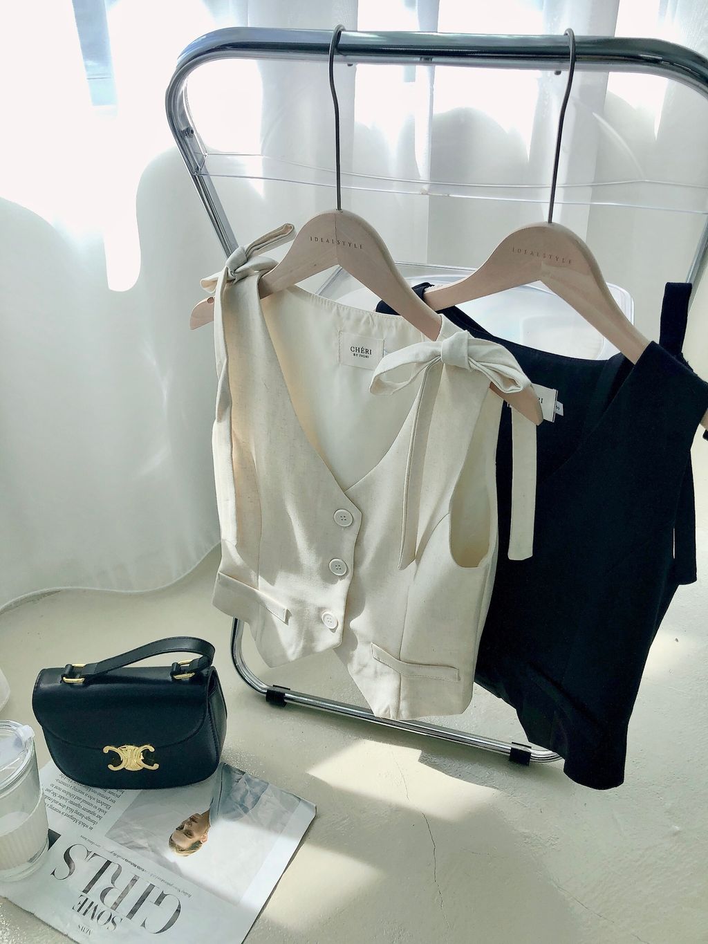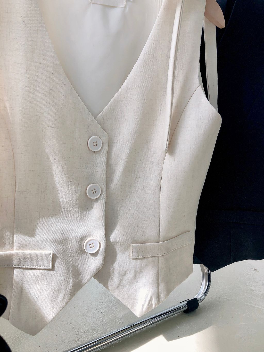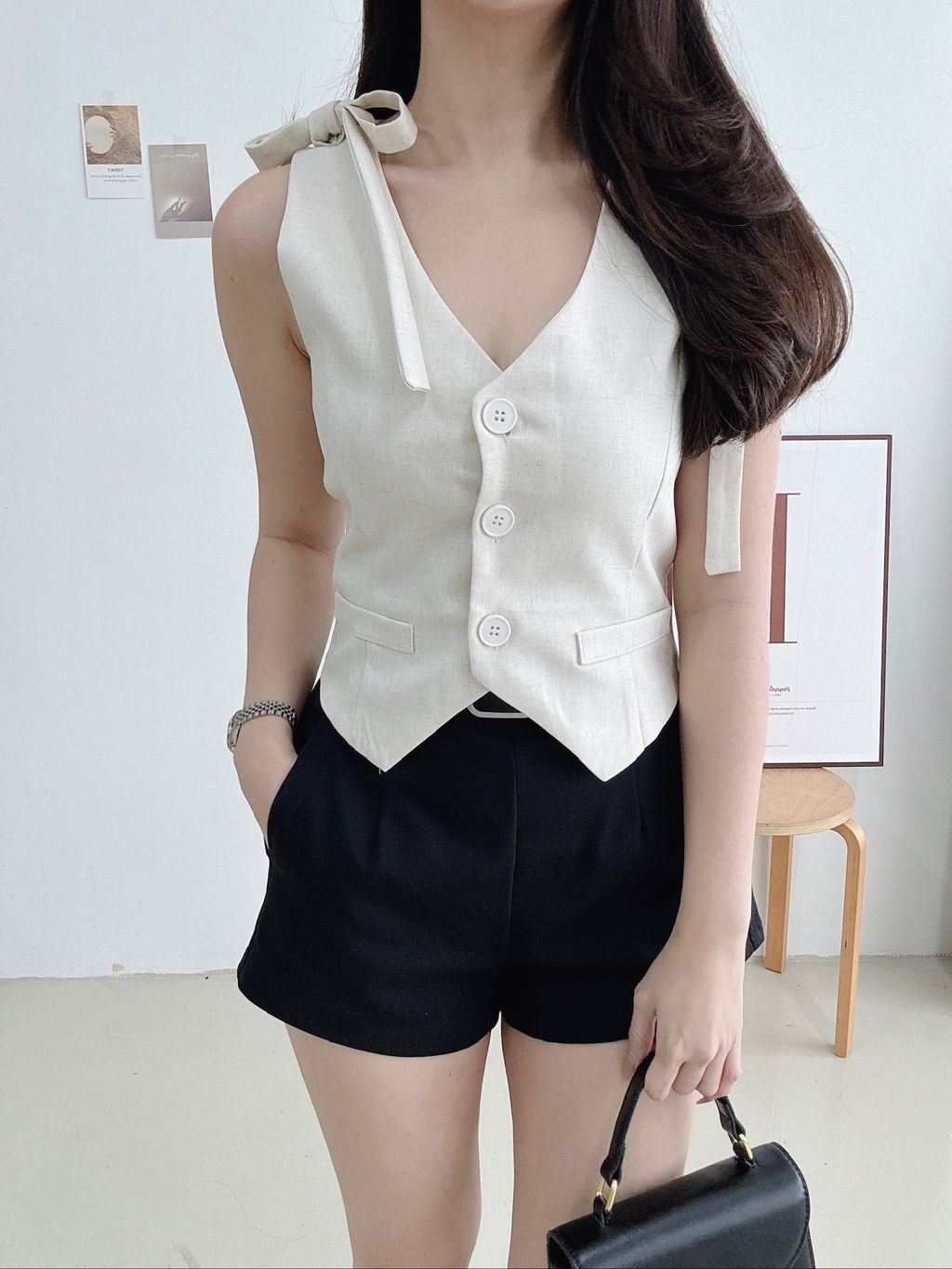 Features: Premium linen cotton materials , comfy texture , suit vest top design , functional buttons , self-tied ribbon , easy to match with other bottoms.