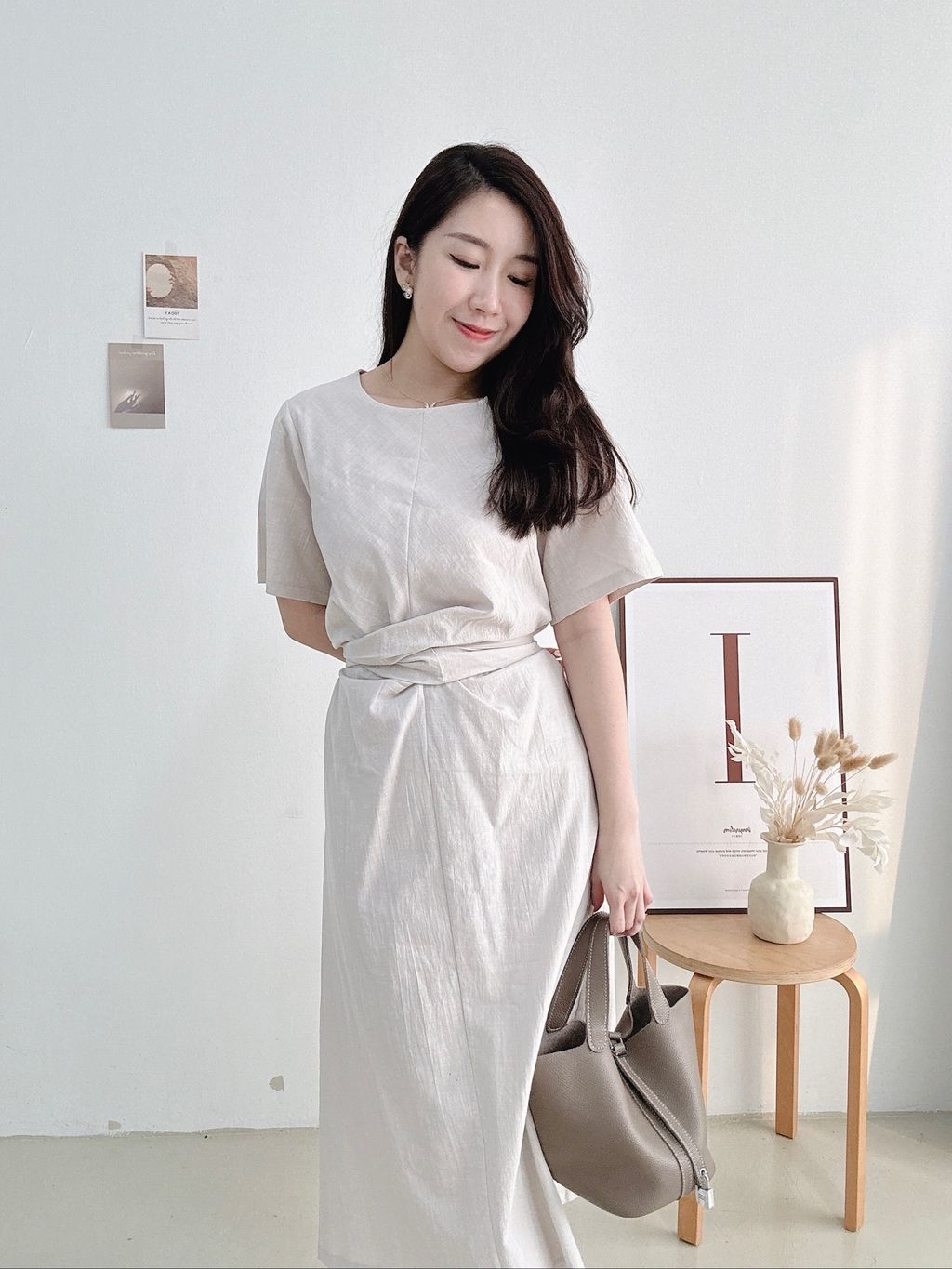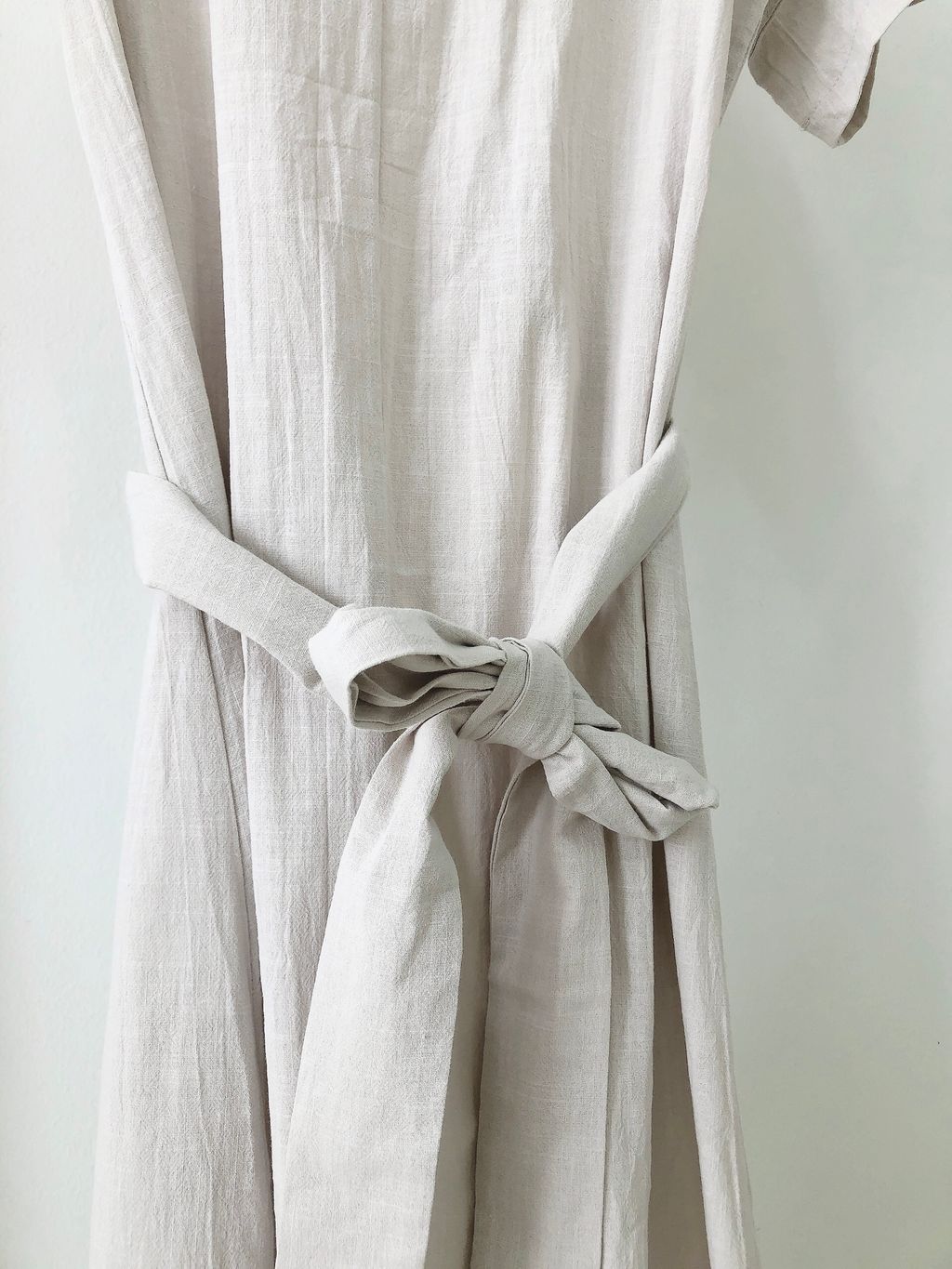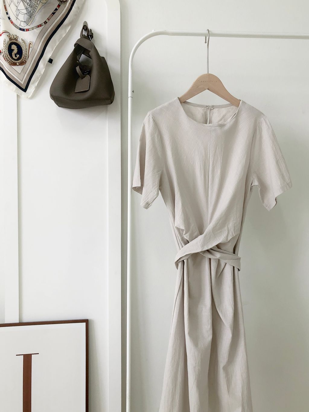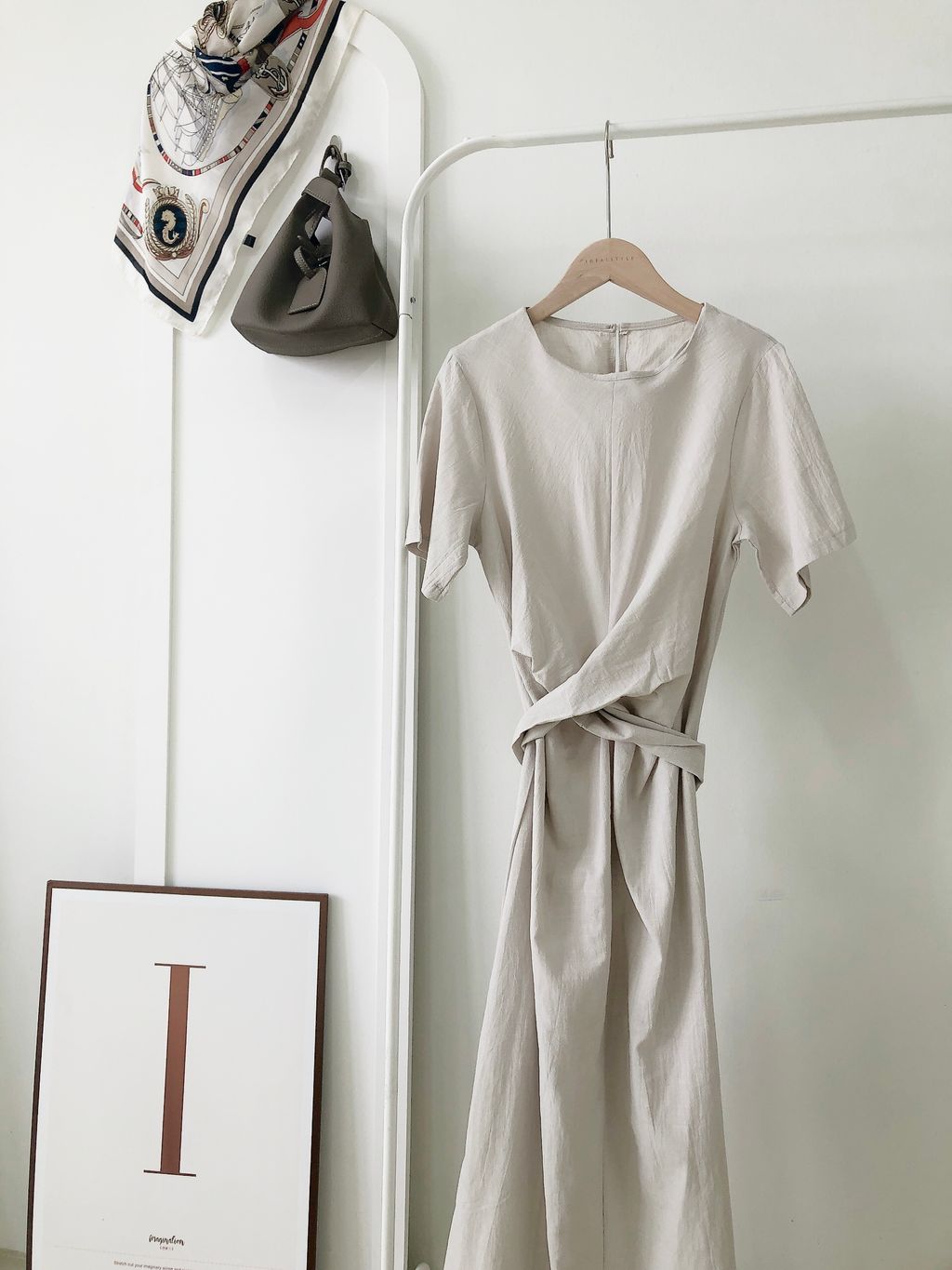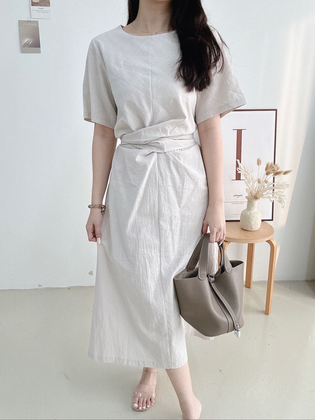 Features: Premium linen cotton material , comfy texture , cross twist short sleeves dress , round necked , functional neck button , self-tied ribbon .