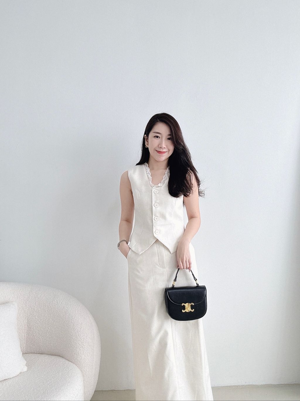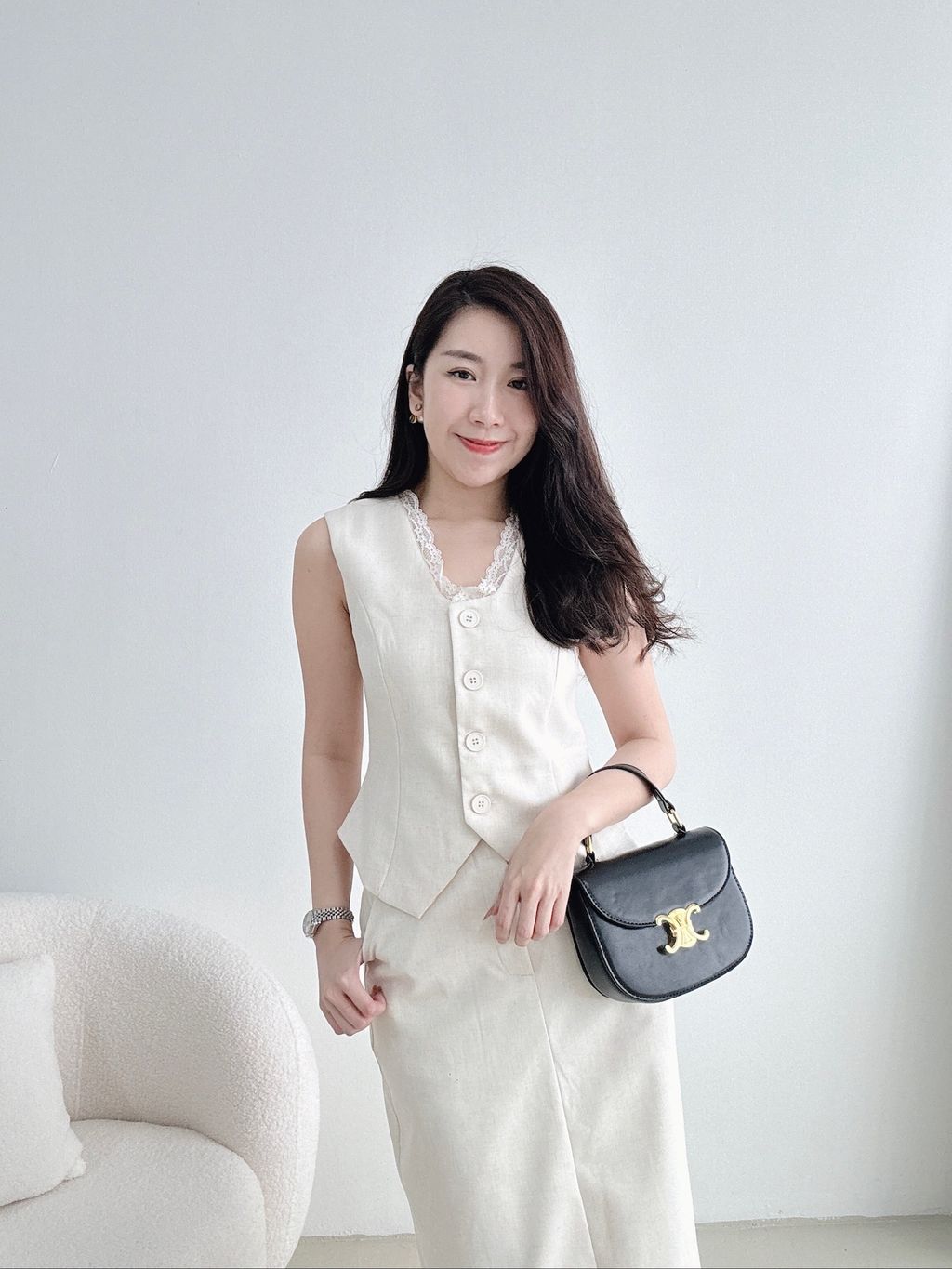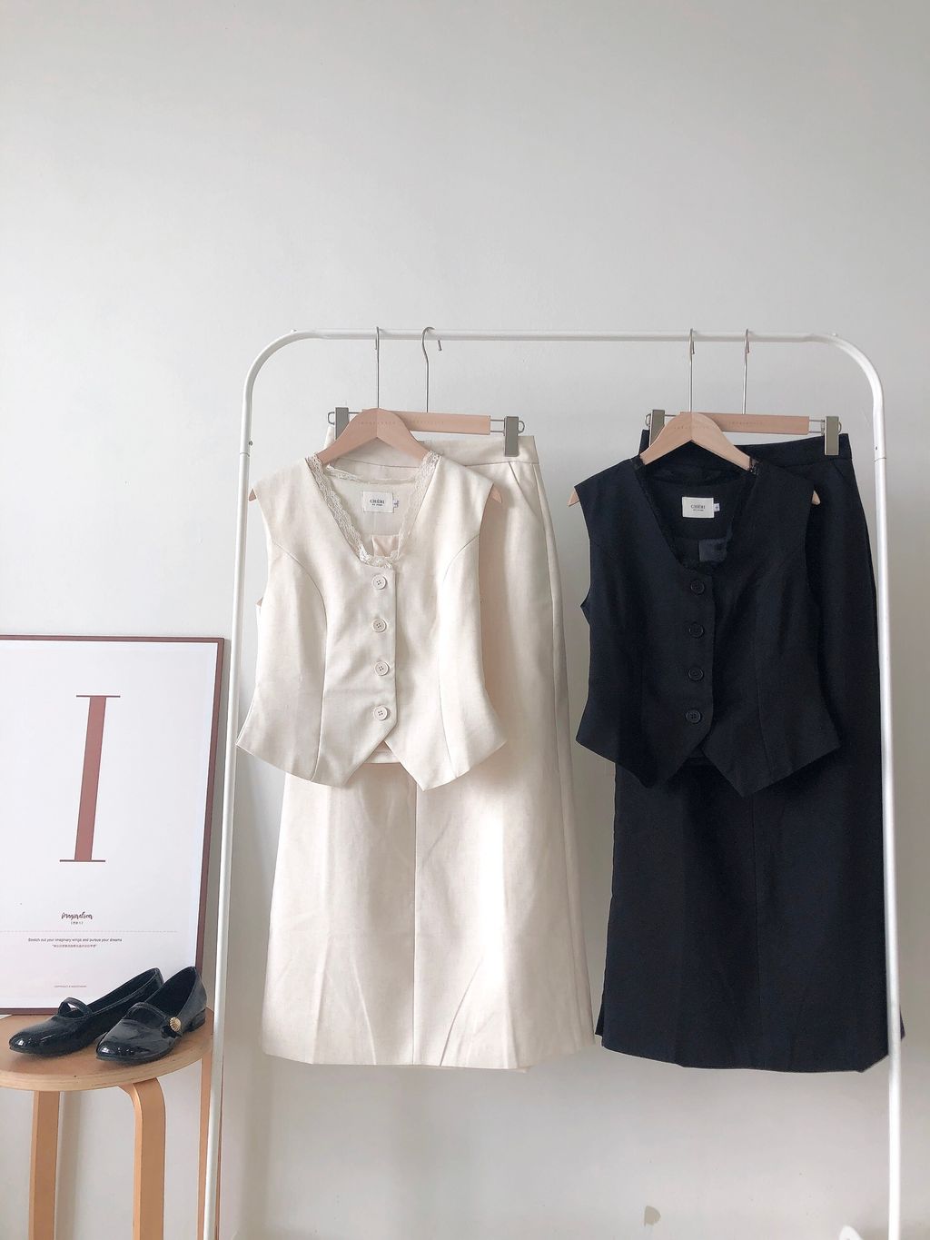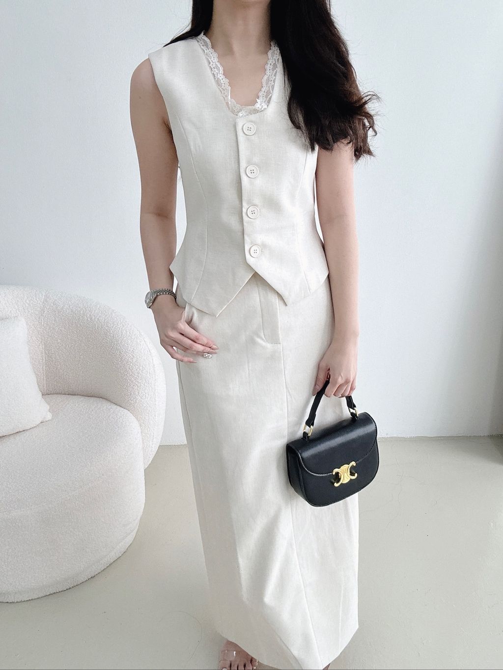 Features: Premium linen cotton material , comfy texture , sleeveless vest suit set design , button-up vest top , high-waisted suit skirt , come in one set , functional buttons , concealed side zipper , with side pockets , come with inner lining , can match with other top and bottoms separately .