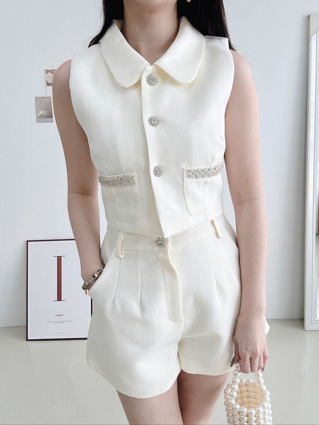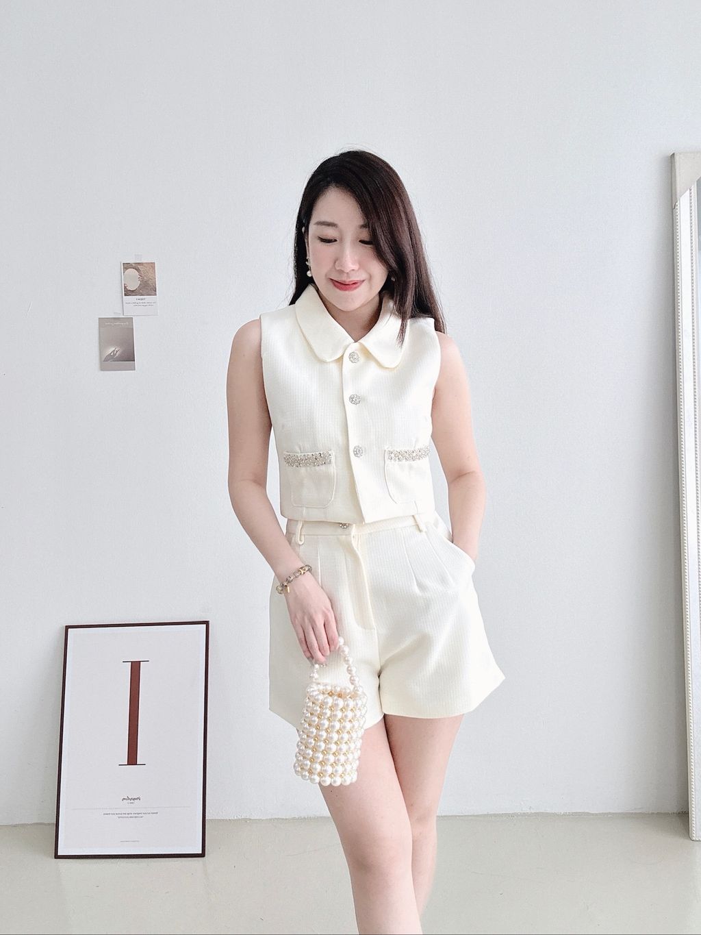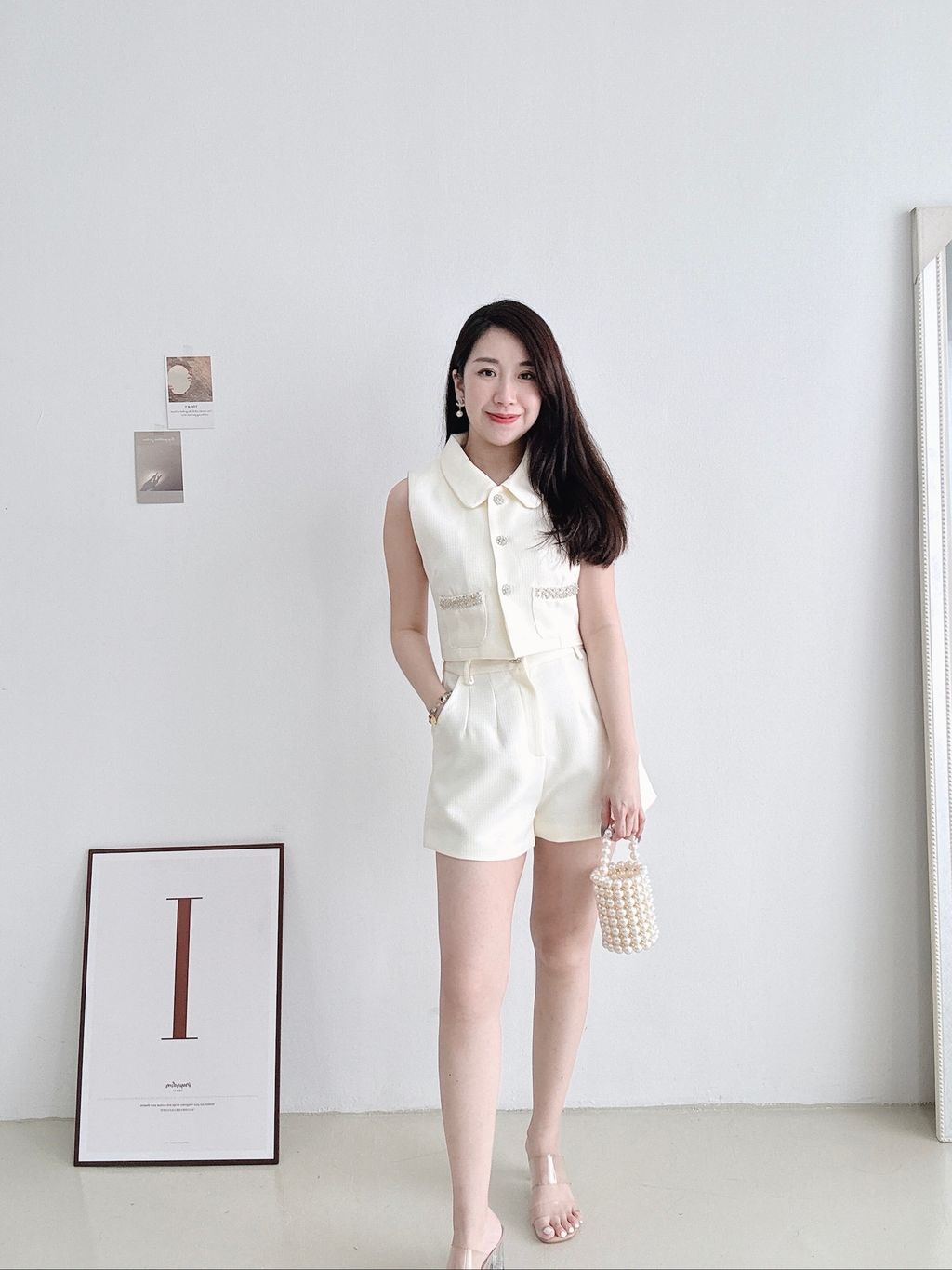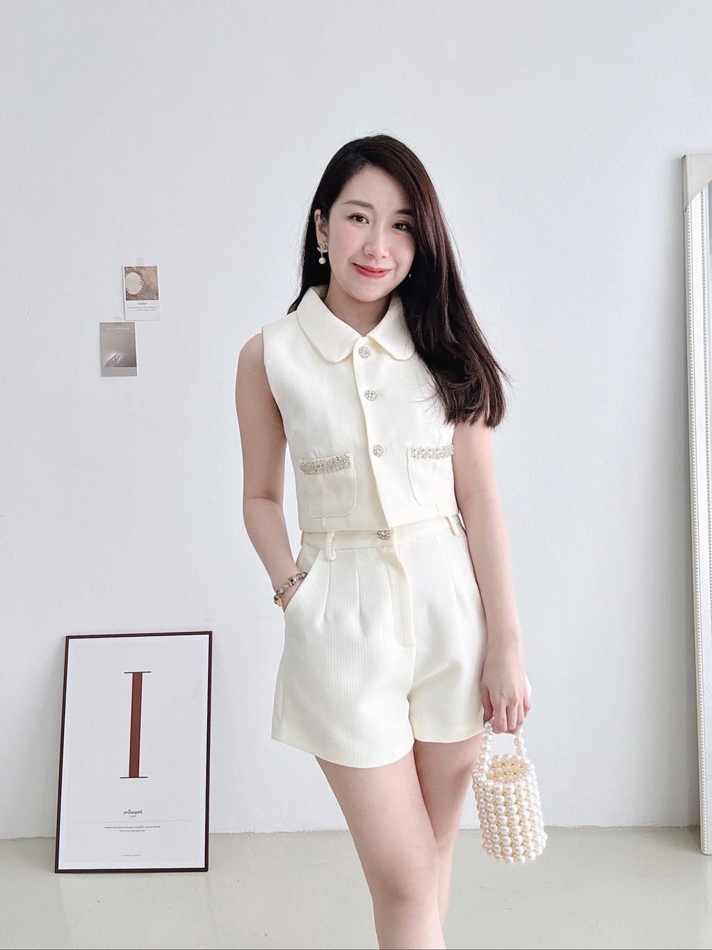 Features: Premium tweed cotton material , sleeveless tweed set design , button-up collared tweed vest , A-shaped tweed shorts , come in one set , high waisted , functional buttons , zipper , side pockets , come with inner lining , can match with other top and bottoms separately .